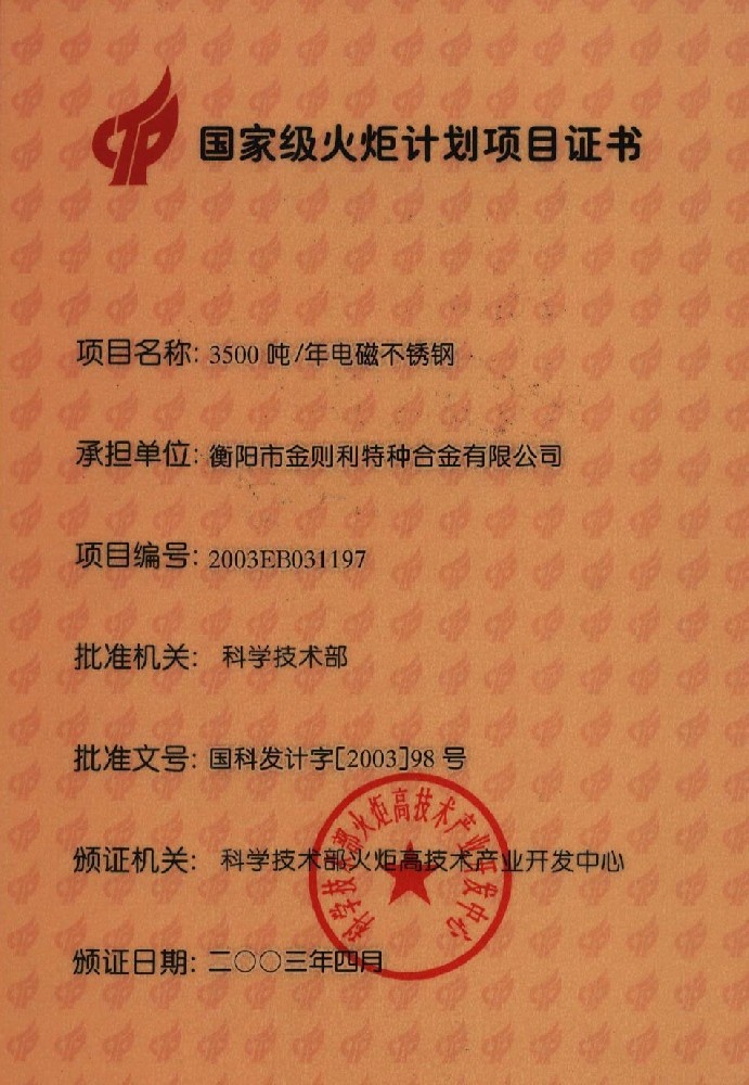 | 國(guó)家級(jí)火炬計(jì)劃項(xiàng)目證書(shū) |